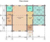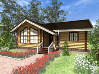 Небольшой одноэтажный дом с оригинальной архитектурой из оцилиндрованного бревна подойдет для небольшой семьи или для загородного сезонного отдыха.