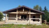 Строительство дома Рожково - Этот небольшой дом из оцилиндрованного бревна 240 диаметра с финским пазом придётся по вкусу тем, кто ценит простоту и уют. Дом хорош тем, что, несмотря на небольшие габариты, он включает в себя все помещения для комфортной жизни в нём. Удачно расположилась гостиная, соединяющаяся с кухней большим проёмом, с/у, холл, котельная, тамбур и терраса