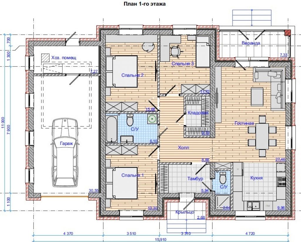 Этот проект дома может быть реализован в Оцилиндрованном бревне камерной