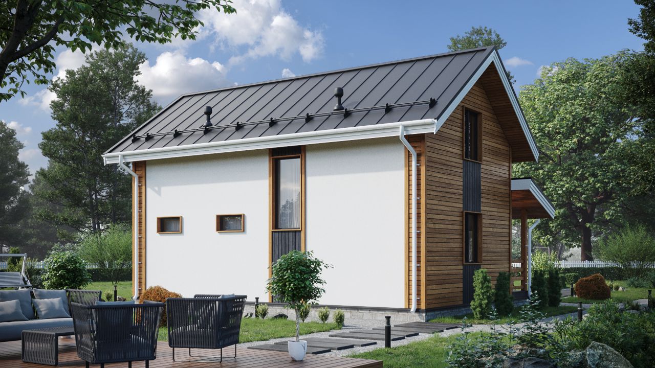 Готовый загородный дом сезонного проживания и временного пребывания зимой. С обшивкой имитацией стен снаружи, утепленными полами и потолками, окнами и дверью.